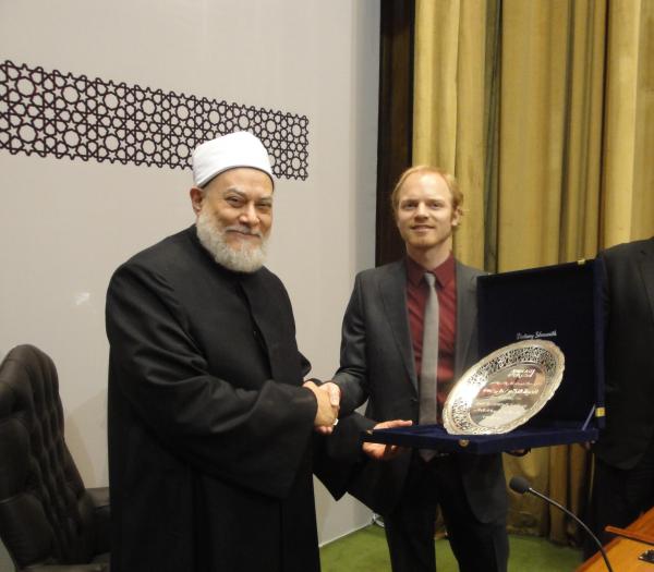 In recognition of the forthcoming end of the Grand Mufti’s tenure in office, AMIDEAST Program Manager Matthew Kuehl presented him with an engraved silver plate, which reads: