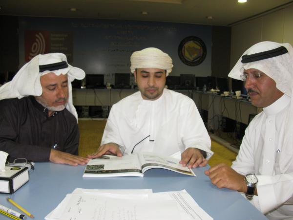 AMIDEAST conducted a five week General English course for employees in the Coorporation Council for the Arab States of the Gulf - Secretariat General (GCCSG) in December 2012. The picture shows three students from the class working collaboratively on their final project.