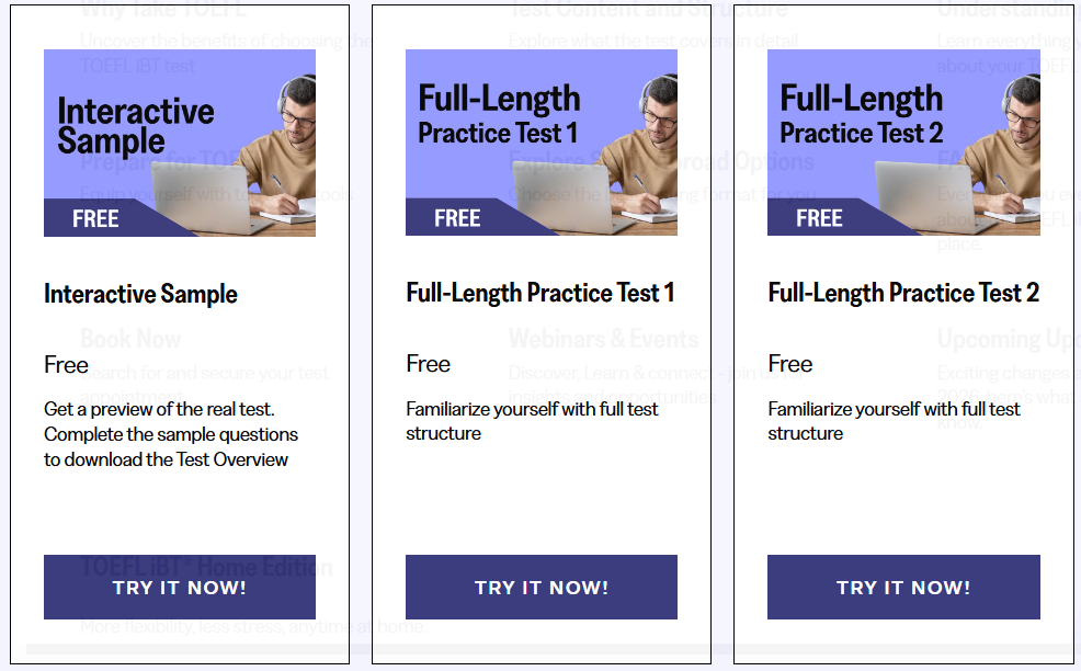 Access free TOEFL preparation resources and sample tests to help your students achieve their goals. Get Started with a TOEFL iBT Sample Tests.